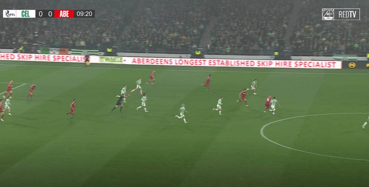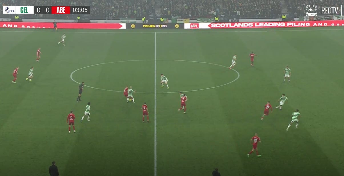 Lack of width on transition. Celtic’s structure in possession saw Keskinen in particular have to go inside with Valle when he tucked in. When Aberdeen won it back, there just wasn’t enough time to get wide quickly and into space and passes just ended up going down Carter-Vicker’s throat.