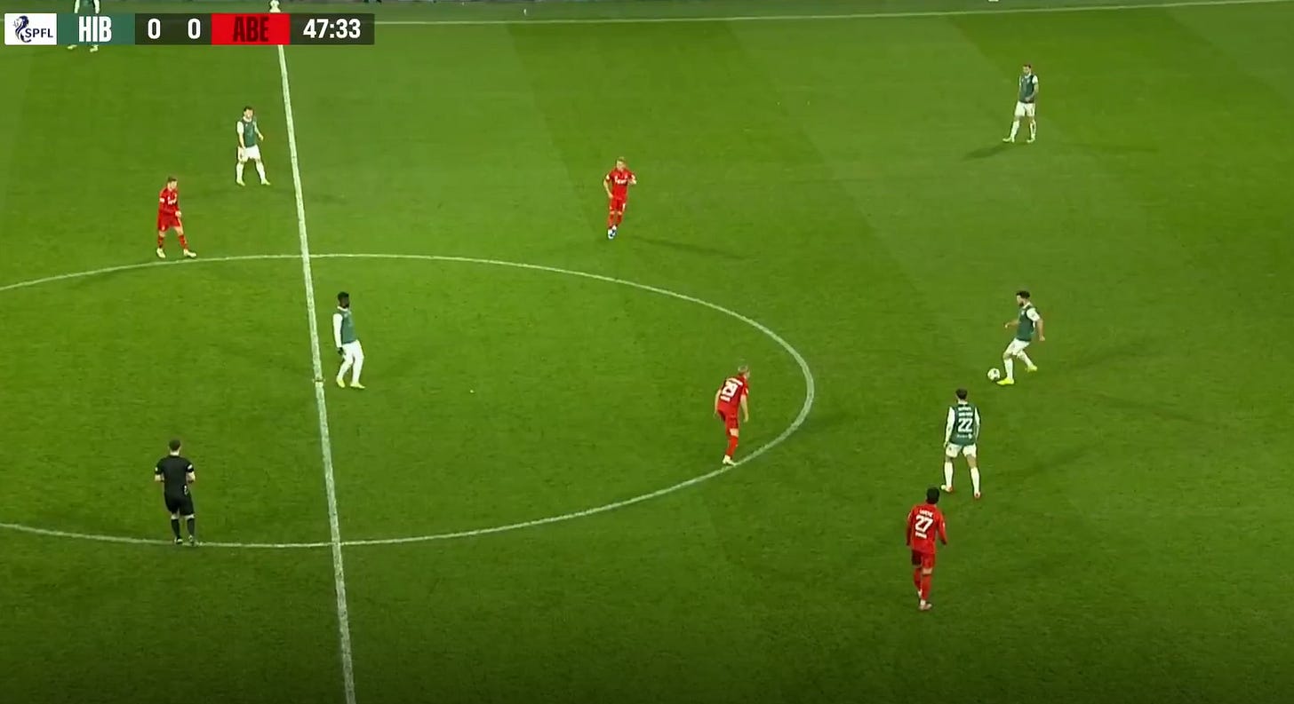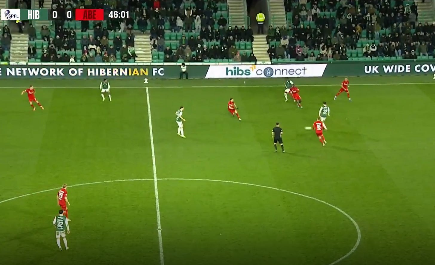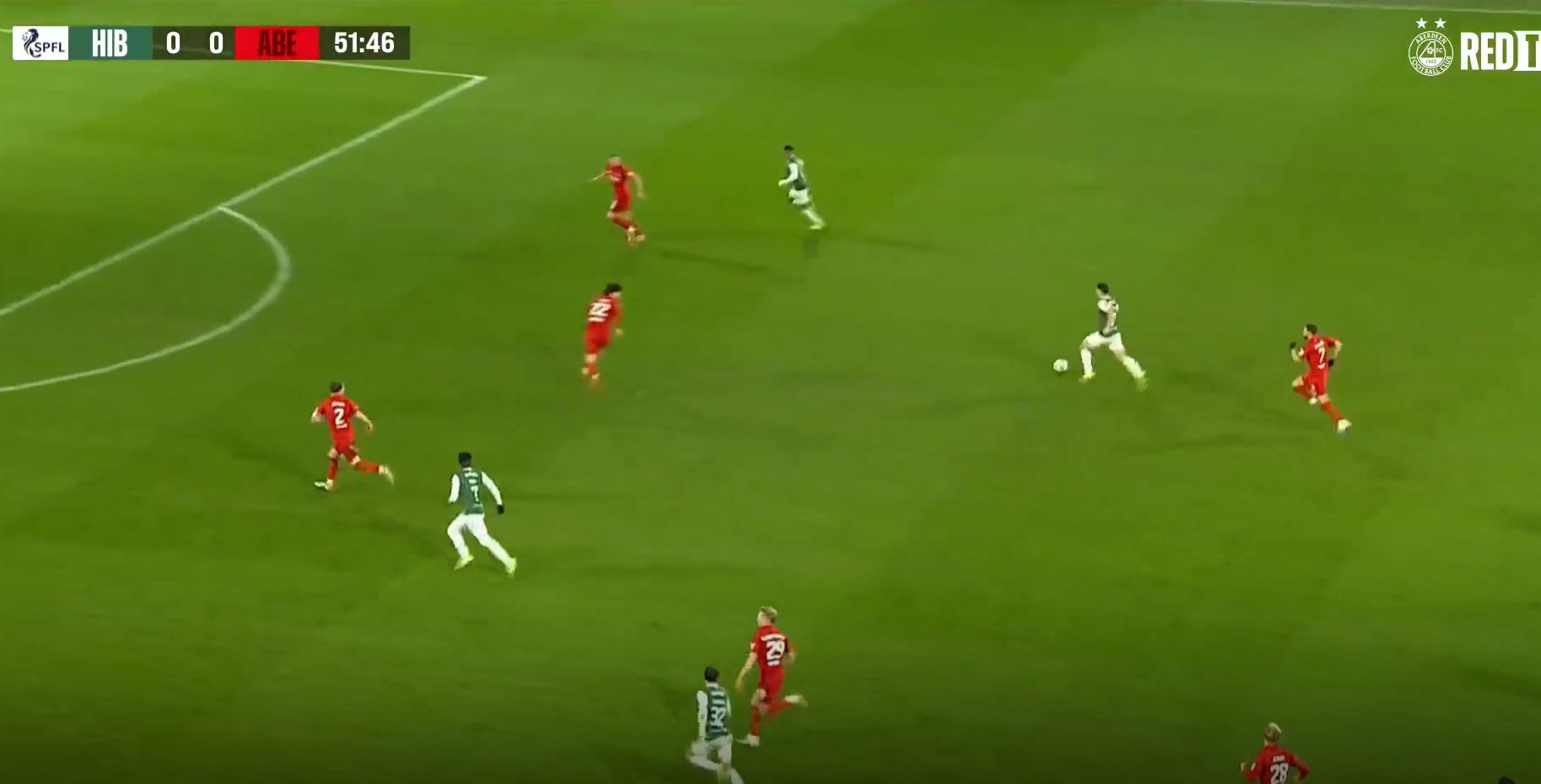 The first two images are in more settled possession where the Hibs midfielder has been able to find a little pocket of space behind the Aberdeen midfield and is then able to drive at the defence.