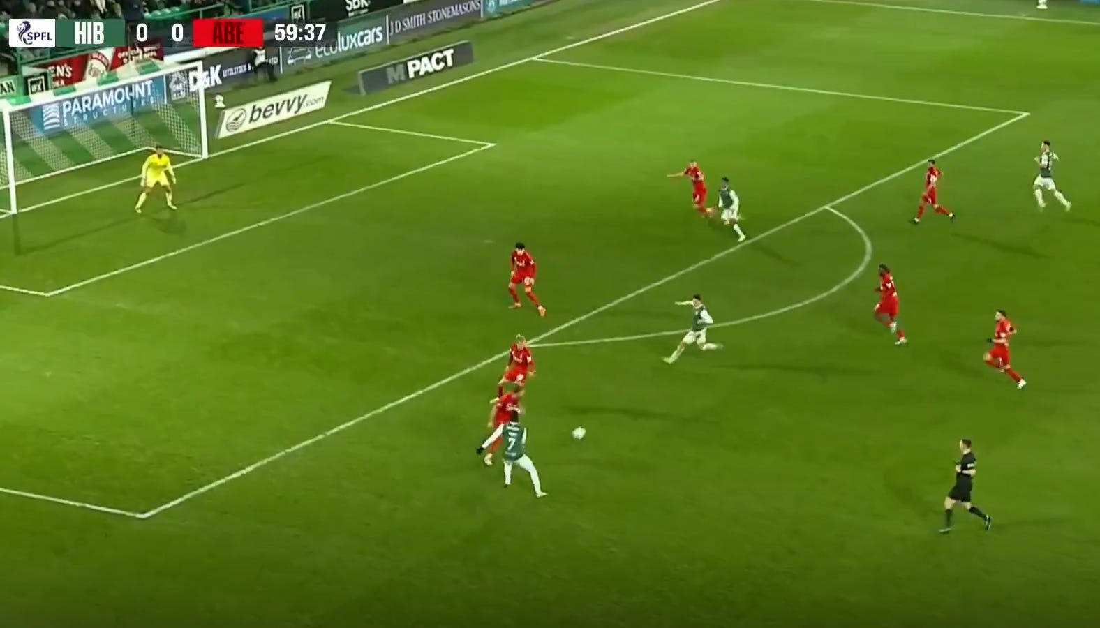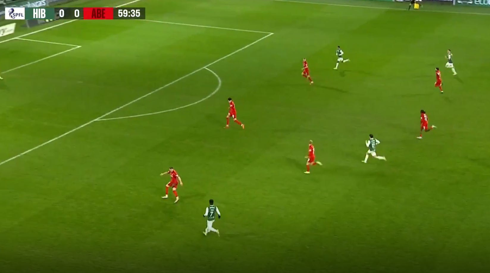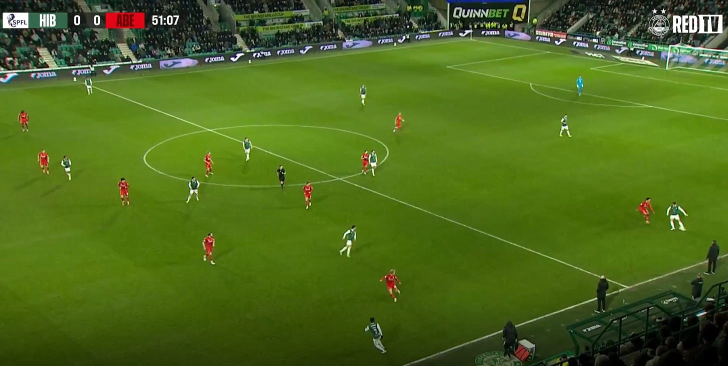 The first two images are in more settled possession where the Hibs midfielder has been able to find a little pocket of space behind the Aberdeen midfield and is then able to drive at the defence.