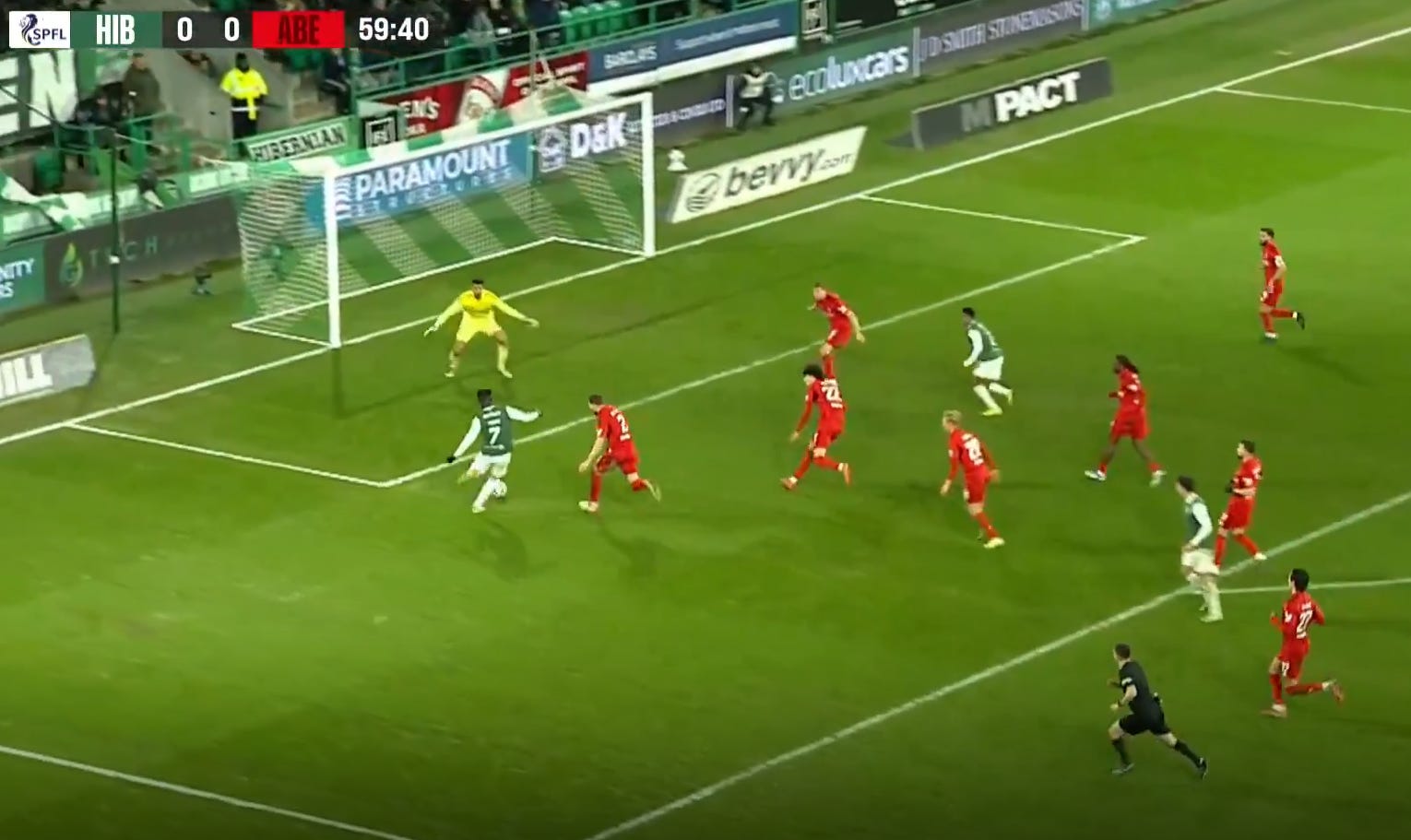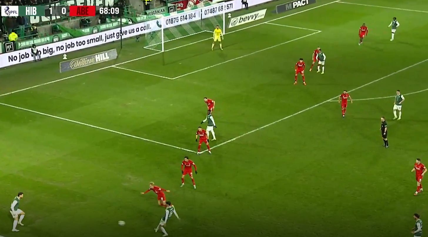 Hibs’ opener would be one you’d be quite happy with if it was scored by men in red but that doesn’t mean you can’t complain. Steve Cowan on RedTV laid the initial blame at Stuart Armstrong for a misplaced pass at the start of the move. I don’t know if it was totally on him, rather just not being quite on same page as Aouchiche. But anyway, ok fair enough. Hibs get it then Mulligan wrestles off the challenges (won’t let him get away with that again), one pass later and Hibs are running at the Dons defence.
